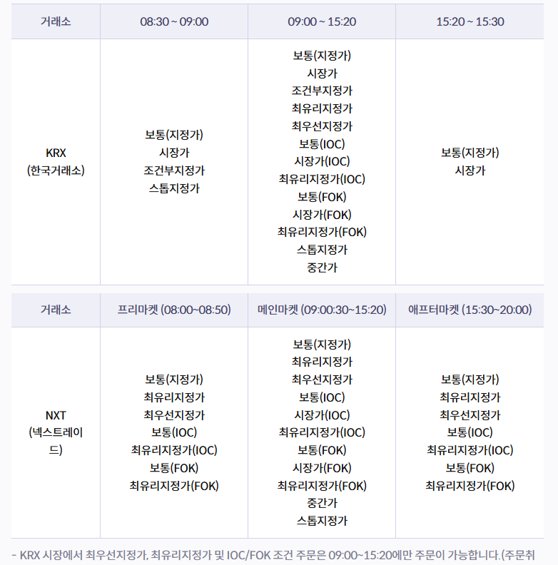 • 지정가 / 시장가 / 조건부 지정가/ 최유리 지정  등