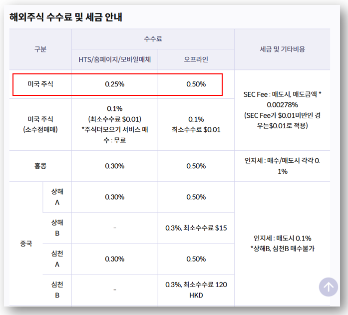 - 미국 주식 매매 수수료: 기본 0.25% (이벤트 시 0.07%까지 할인)