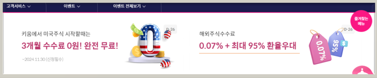 환율 우대를 받기 위해서는 꼭 키움증권 사이트나 앱에서 이벤트 탭에서 해외주식 수수료 이벤트를 꼭 신청해주셔서 95% 환율 우대 서비스를 받으세요!