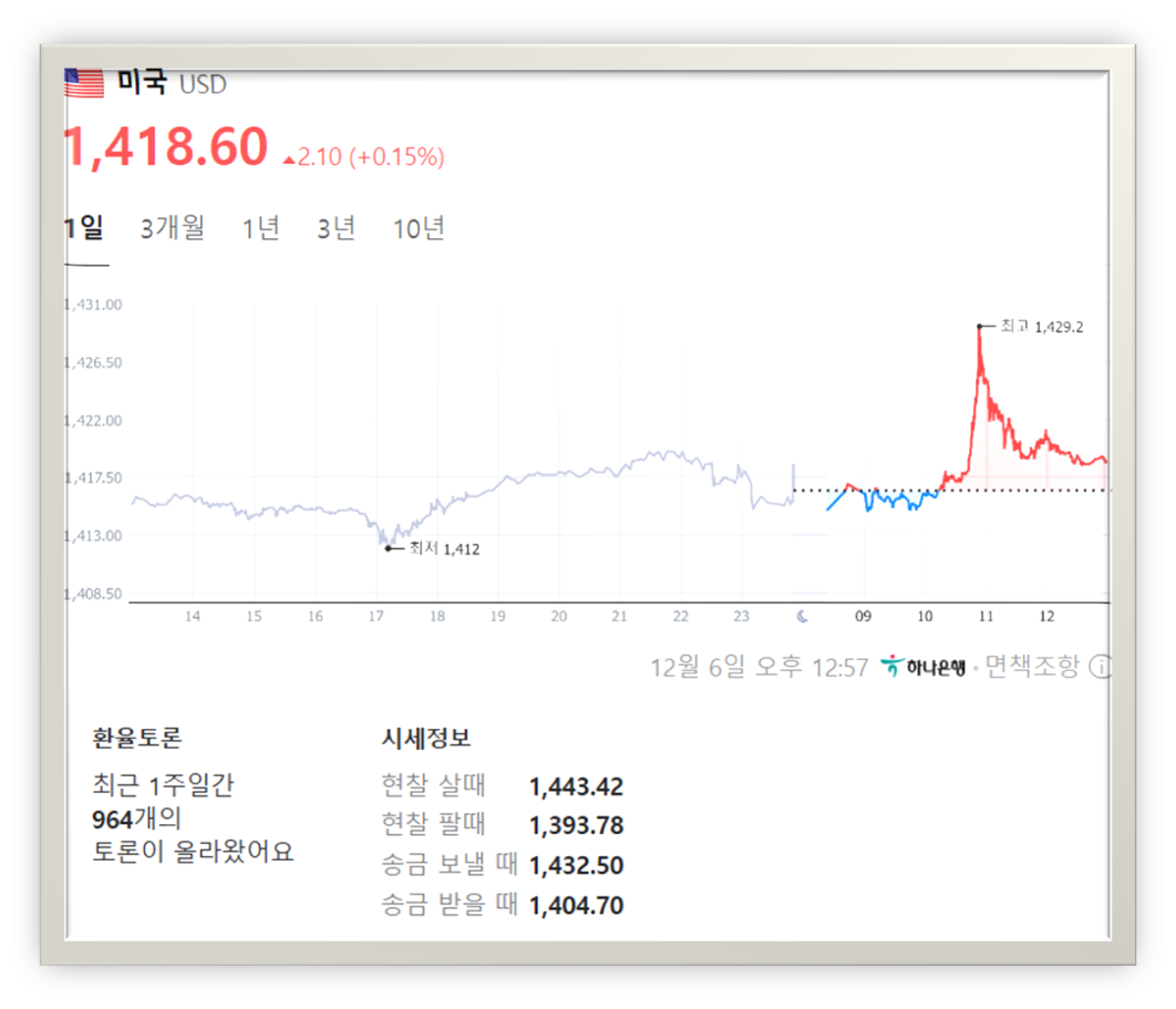 ✔️현재 1,418.80원으로 1,410원대는 유지하고 있는 상황인데요, (2024.12.06 기준)