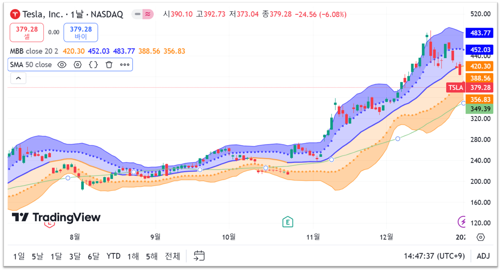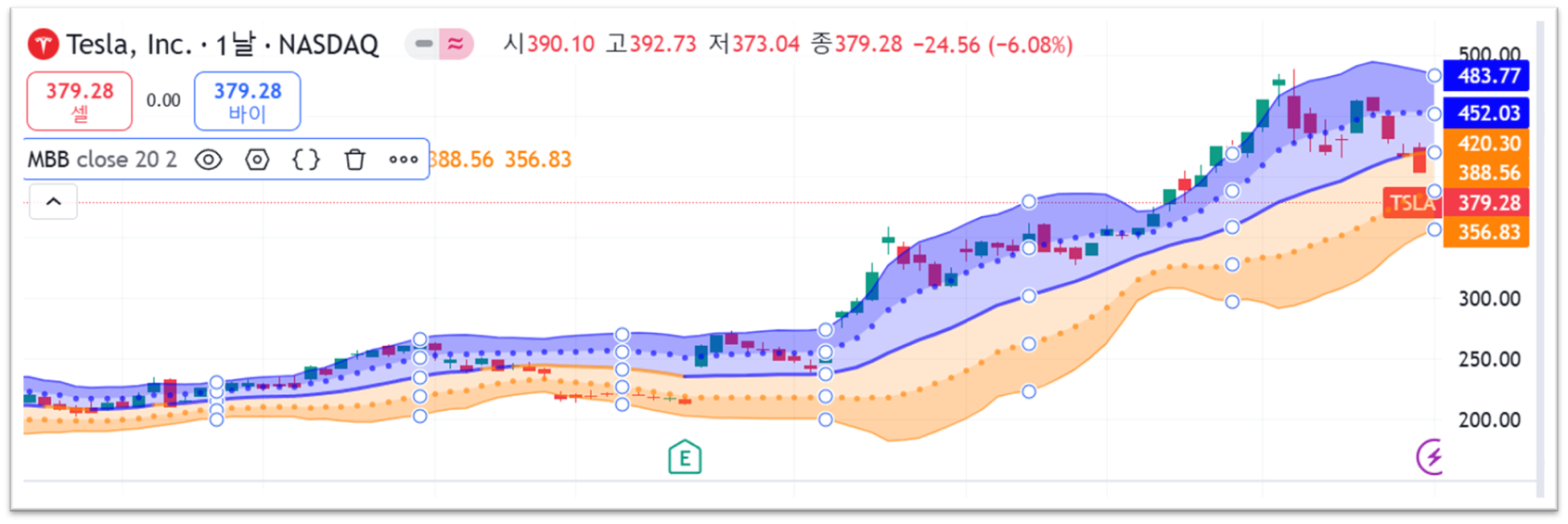 - 50일 이동평균선 (349.83) : 하단 밴드 아래로 내려가면, 50일 이동평균선(초록선) 이 다음 지지선 역할을 할 수 있습니다.