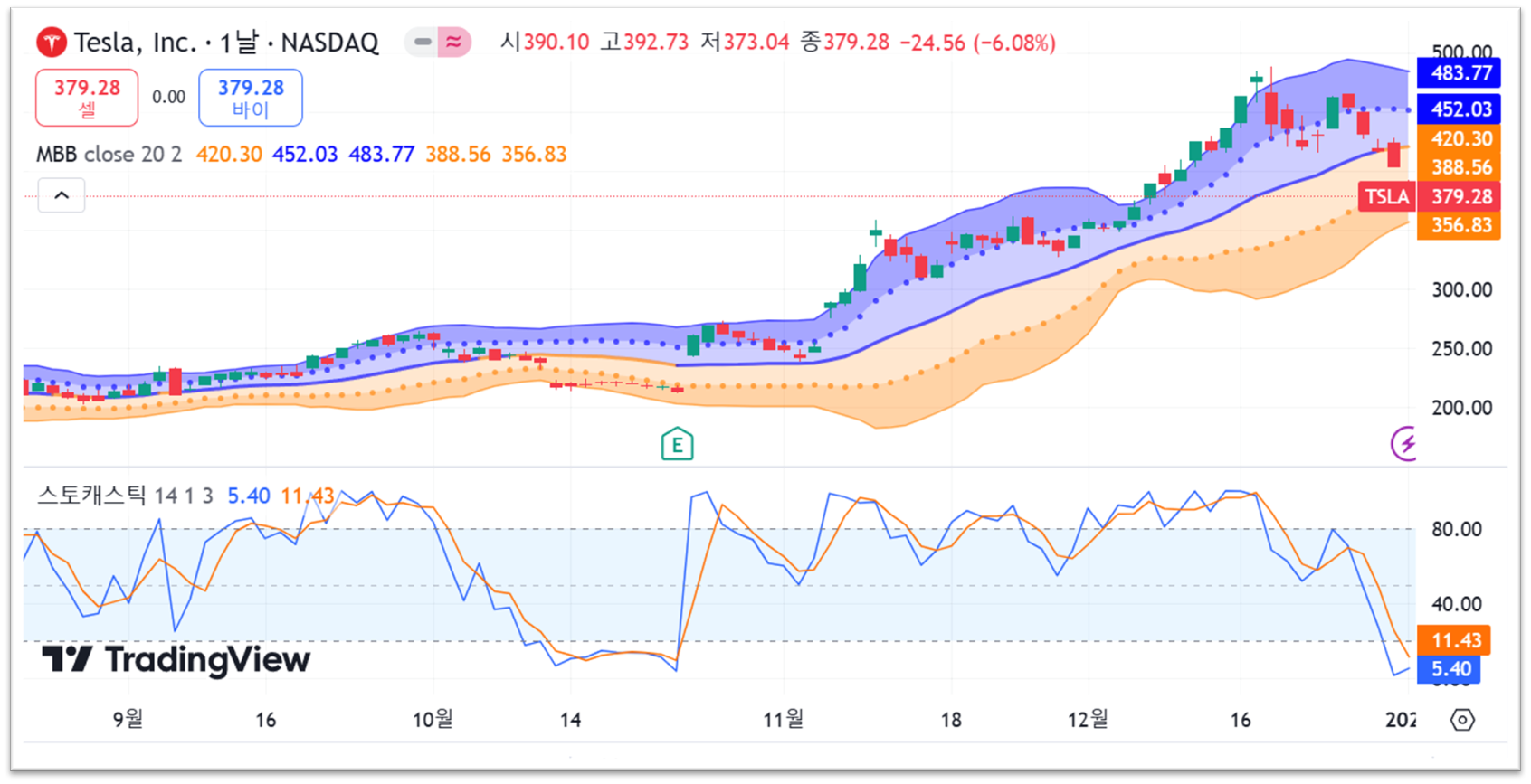 - 주가가 하단 밴드에 도달하면서 스토캐스틱이 골든 크로스를 형성한다면 강력한 매수 신호로 작용될 수 있는데요, 하지만 만약 주가가 하단 밴드(356.83)를 이탈한다면 추가 하락 가능성 또한 있으니 유의하여야 합니다.
