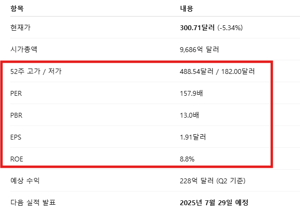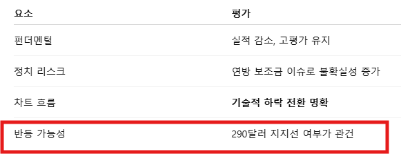- 주봉상 지지선: 295달러, 이탈 시 275달러까지 가능
