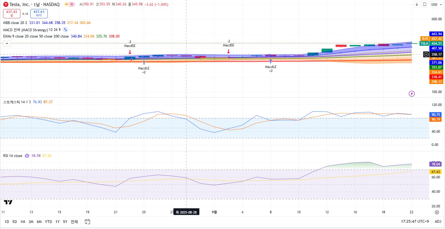 현재 테슬라는 과매수 구간이므로, 단기 과열 상태로 지금 매수하기에는 위험이 있어 보여요.