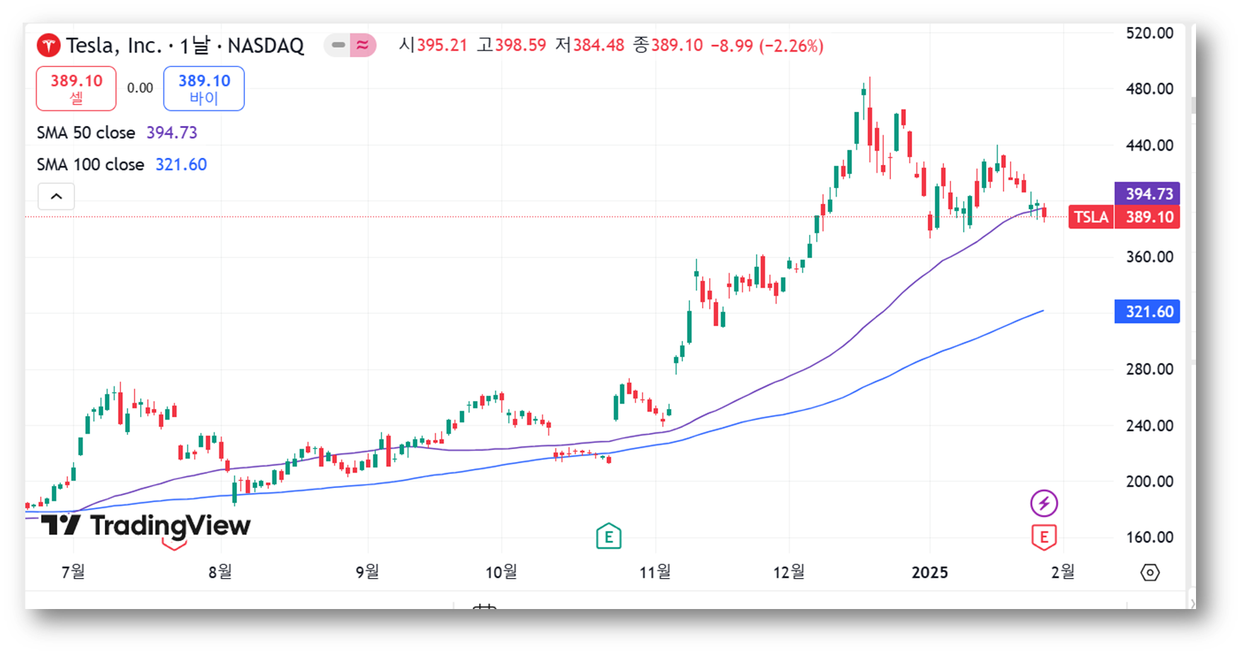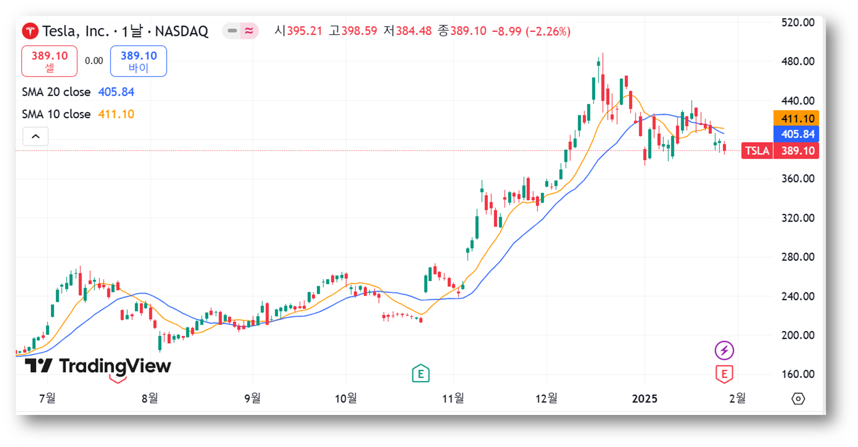 - 현재 주가(389.10달러)는 10일 이동평균선 아래에 위치.