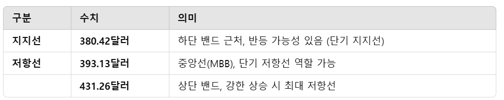 - 주가가 하단 밴드 근처에서 지지를 받을 가능성 있음(380달러 수준).
