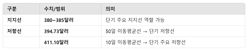- 50일선(394.73달러) 돌파 여부를 확인하며, 이후 410달러를 다시 넘는지 주목.