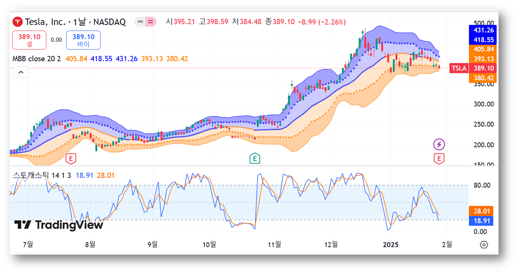 - 현재 주가(389.10달러)는 중앙선 아래에 위치, 단기 약세를 의미.