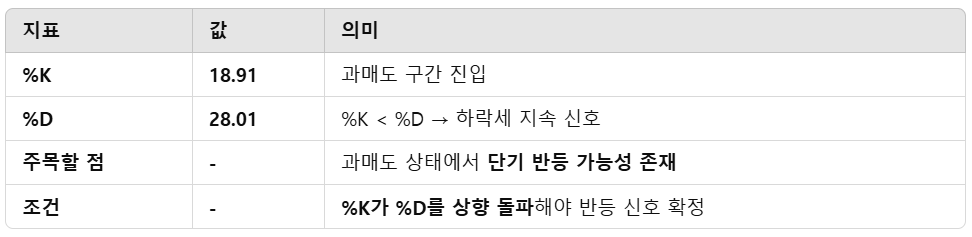 - 다만, %K가 %D를 상향 돌파하지 않는 한 반등 신호로 확정하기 어려움.