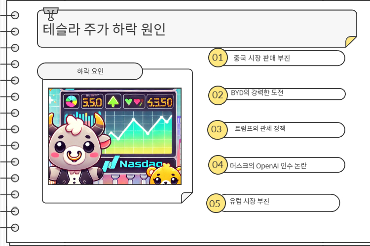 이처럼 테슬라가 계속 하락하는 이유는 여러 악재가 겹쳤기 때문인데요. 주요 하락 원인과 주가 전망에 대해 자세히 살펴보도록 하겠습니다.