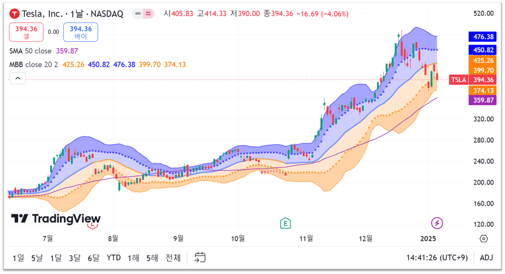 테슬라의 주가는 현재 볼린저 밴드의 중간선(MBB 중심선, 20일 이동평균선) 아래에 위치하고 있습니다. 이는 최근 상승세에서 조정을 받고 있다는 것을 의미하며, 밴드의 하단선에서 지지를 받는지를 체크하셔야 합니다.