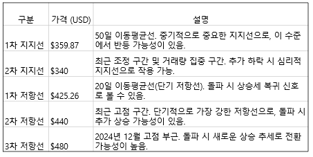 - 1차 지지선: $359.87 (50일 이동평균선) 50일 이동평균선은 중기적으로 중요한 지지선으로 작용할 가능성이 높은데요,이 수준에서 하락이 멈추고 반등할 가능성이 존재합니다.