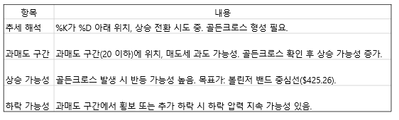 - 상승 가능성: 스토캐스틱 지표가 골든크로스를 형성하면 단기적인 반등 가능성이 높아질 수 있습니다. 이는 주가가 다시 볼린저 밴드 중심선($425.26)을 목표로 상승할 가능성을 나타냅니다.