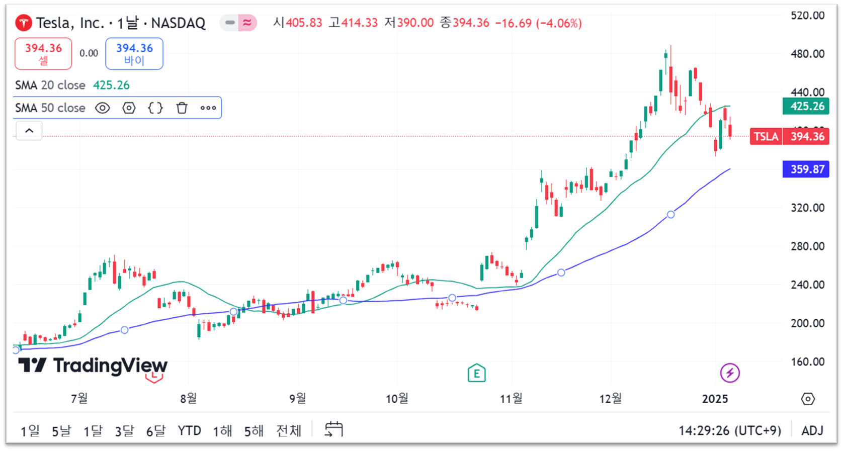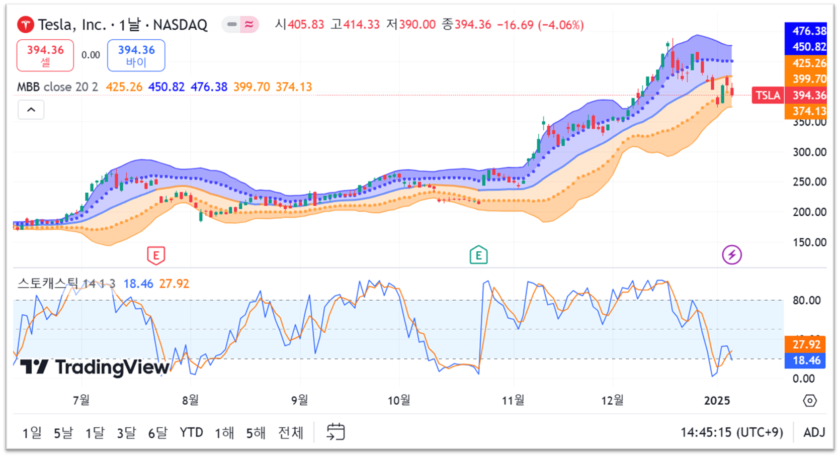 테슬라의 주가는 현재 볼린저 밴드의 중간선(MBB 중심선, 20일 이동평균선) 아래에 위치하고 있습니다. 이는 최근 상승세에서 조정을 받고 있다는 것을 의미하며, 밴드의 하단선에서 지지를 받는지를 체크하셔야 합니다.