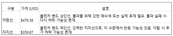 볼린저 밴드의 하단선($359.87)은 강력한 지지선 역할을 하는데요, 하단선 근처에서 주가가 반등할 가능성이 높으나, 만약 하단선을 이탈할 경우 추가 하락이 이어질 수 있습니다.