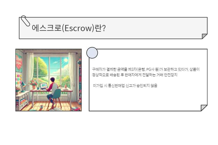- 법적 의무: 통신판매업 신고 시 '구매안전서비스 이용 확인증'(에스크로 가입 확인서)가 필요합니다.