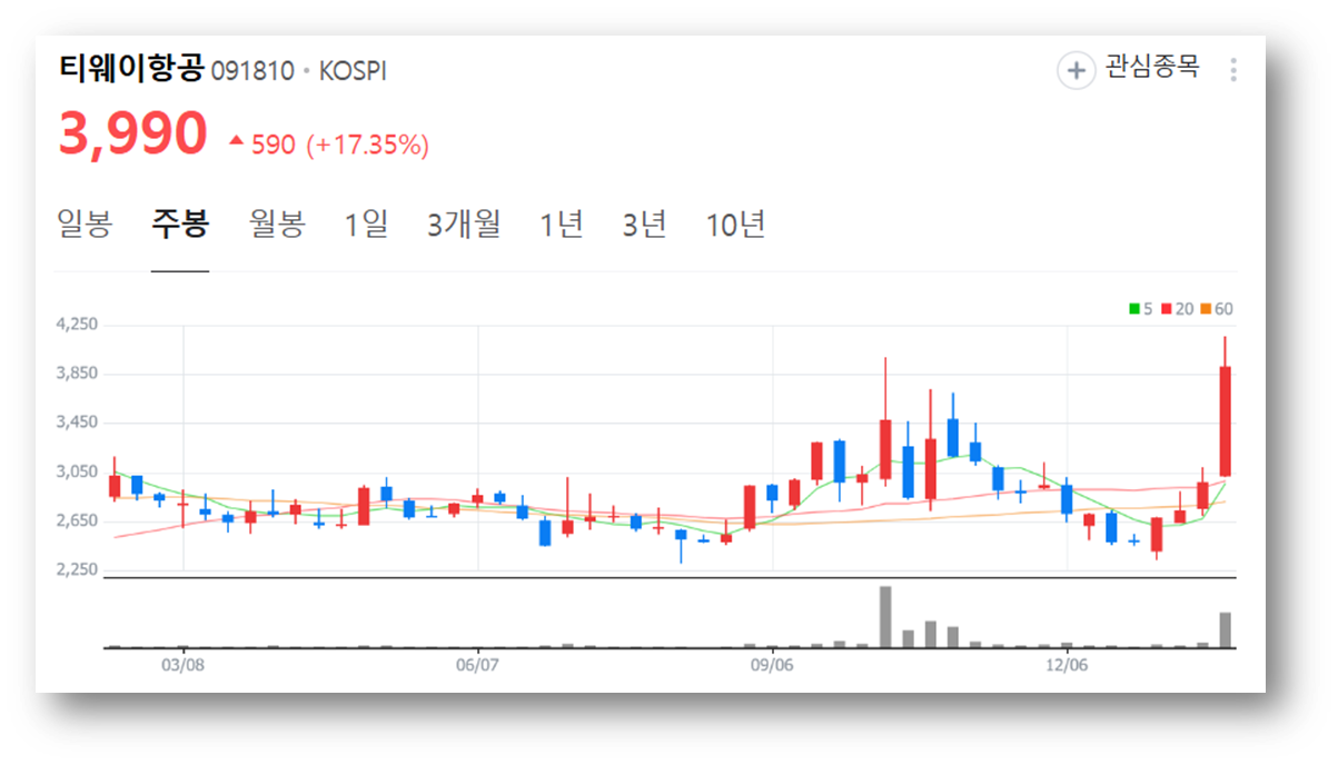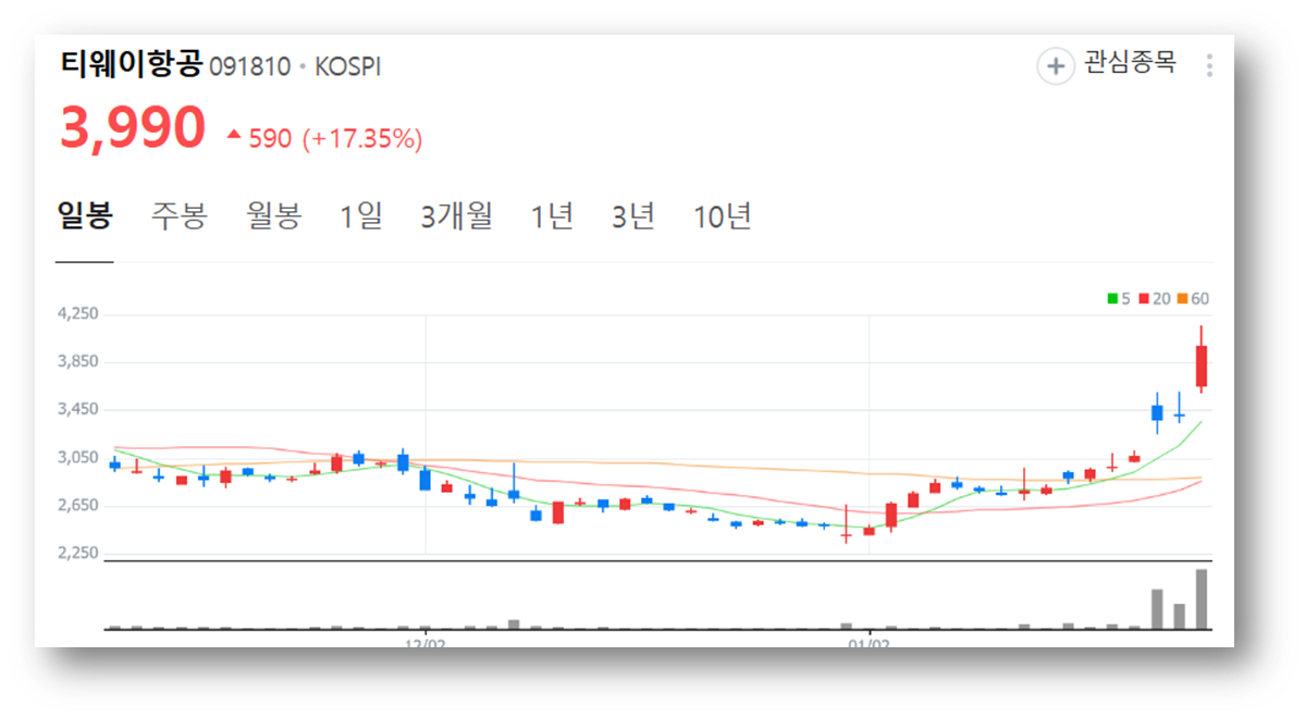티웨이항공 주가가 연일 강세를 보이며 52주 최고가를 경신했는데요, 대명소노그룹의 경영 참여 공식화로 경영권 분쟁과 지분 확보 경쟁에 대한 기대감이 커지며 투자심리가 강화된 것으로 보입니다. 23일 장중 4,160원까지 치솟아 52주 최고가를 기록하기도 했는데요,