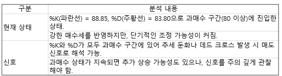 %K와 %D가 모두 과매수 구간에 있으므로, 추세가 둔화되거나 데드 크로스(파란선이 주황선을 하향 돌파)가 발생할 경우 매도 신호로 해석이 가능합니다.