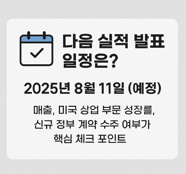 - 매출, 미국 상업 부문 성장률, 신규 정부 계약 수주 여부가 핵심 체크 포인트입니다.