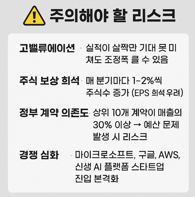 - 정부 계약 의존도: 상위 10개 계약이 매출의 30% 이상 → 예산 문제 발생 시 리스크