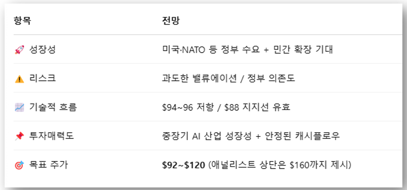 다만 과도한 밸류에이션, 정부 매출 집중도는 리스크로 작용할 수 있으므로 단기보다는 중장기 관점의 분할 매수 전략이 유효할 것으로 보입니다.