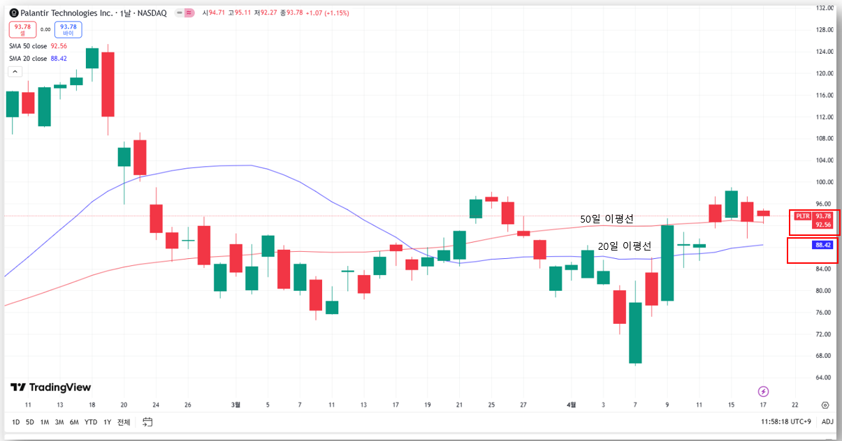 - 단기 이동평균선: 20일선($88.42) > 지지선 역할