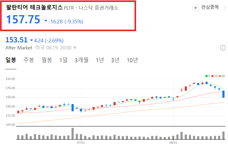안녕하세요! 최근 인공지능(AI) 버블 논란과 기술주 전반의 조정 속에서 팔란티어 테크놀로지스(PLTR) 주가가 급락세를 보이고 있습니다. 어제 9.35%의 급락이 나왔고, 이후 애프터장에서도 2.69% 빠지면서 매도세가 강해요. 8월 들어 5거래일 연속 하락하며 최고가 대비 15% 이상 밀려났는데요. 오늘은 팔란티어의 주가 전망, 목표 주가, 실적 흐름, 차트 분석을 종합적으로 알아볼테니 투자에 참고바랍니다!