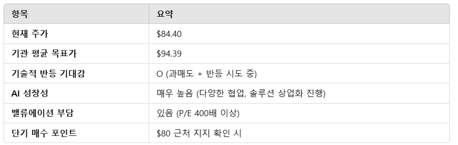 - 현재 주가는 약 $84.40, 최근 하락세 이후 기술적으로 단기 지지선($80) 부근에서 반등 시도 중입니다.