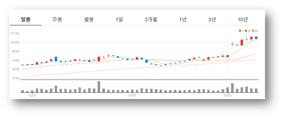 ✔ 단기 상승세 유지 중 (이동평균선 10일 = 98.38, 이동평균선 20일 = 86.12)