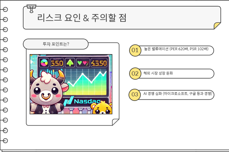 🚨 미국 시장에서는 강력한 성장을 보이지만, 유럽 등 해외 시장에서의 확장이 예상보다 더딘 점이 리스크로 작용할 수 있습니다.