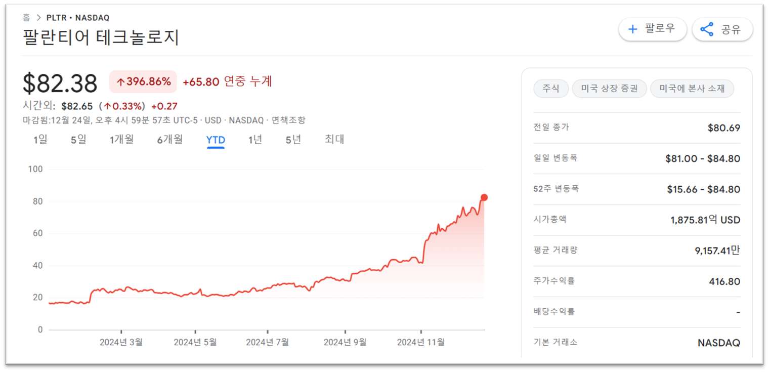 💡요새 핫한 기업, 트럼프 수혜주라고도 불리우는 팔란티어의 주가 시세 먼저 알아보겠습니다.