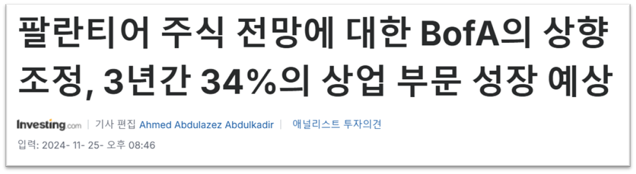 ✅Wedbush Securities의 댄 아이브스(Dan Ives): 2024년 11월 25일, 팔란티어의 목표 주가를 기존 $57에서 $75로 상향 조정하며, '아웃퍼폼(Outperform)' 등급을 유지했습니다.