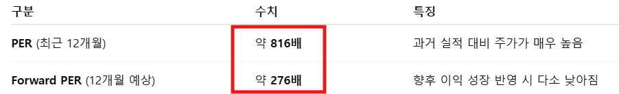 - PER: 현재 주가(186.96달러) ÷ 최근 12개월 EPS(약 0.23달러) ≈ 816배