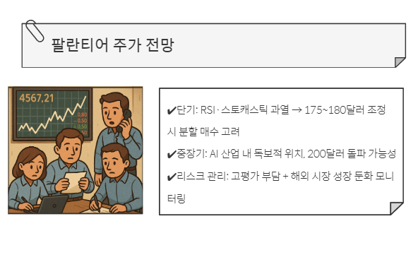 - 단기: RSI·스토캐스틱 과열 → 175~180달러 조정 시 분할 매수 고려