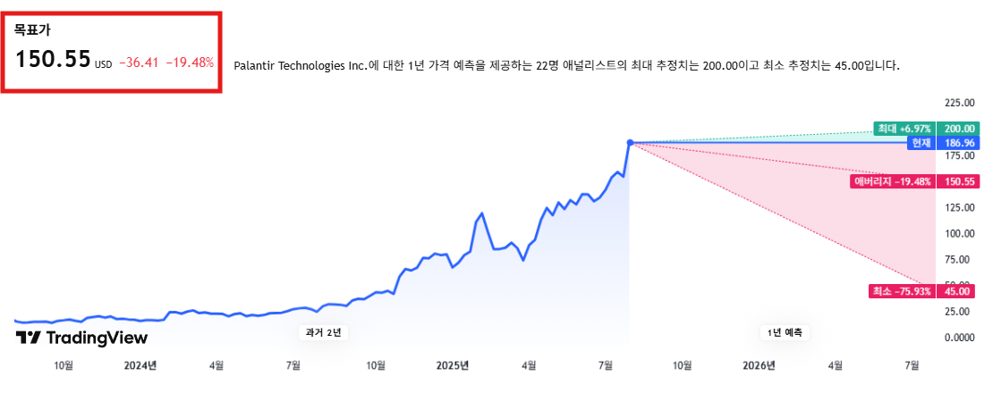 팔란티어의 목표 주가는 150달러 정도로, 지금 현재 증권사의 목표 주가를 뛰어 넘고 있는데요,