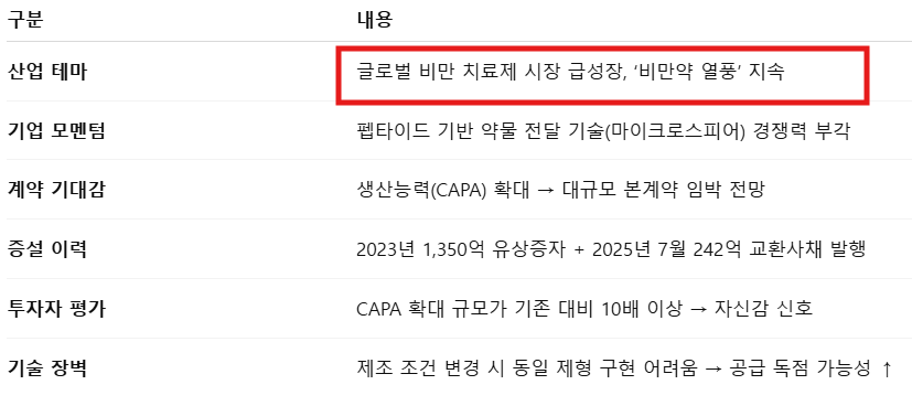 펩트론은 비만 치료제 시장 성장과 CAPA 확대를 기반으로 장기 성장성이 부각되고 있습니다.