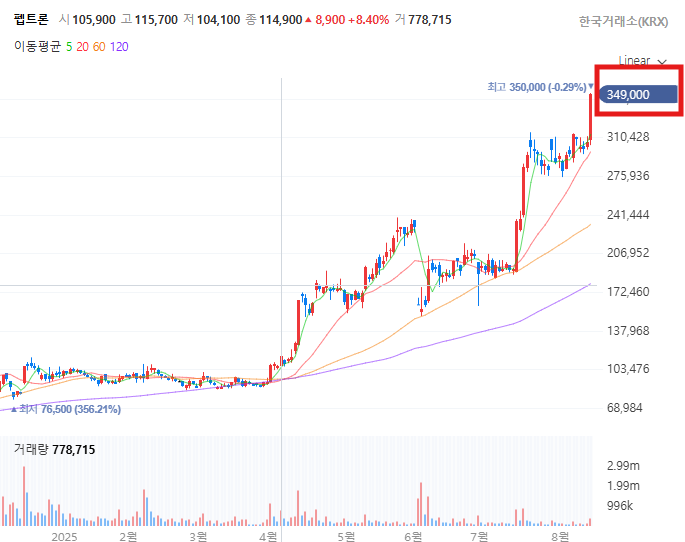 - 52주 최고가: 348,500원 (장중 돌파)