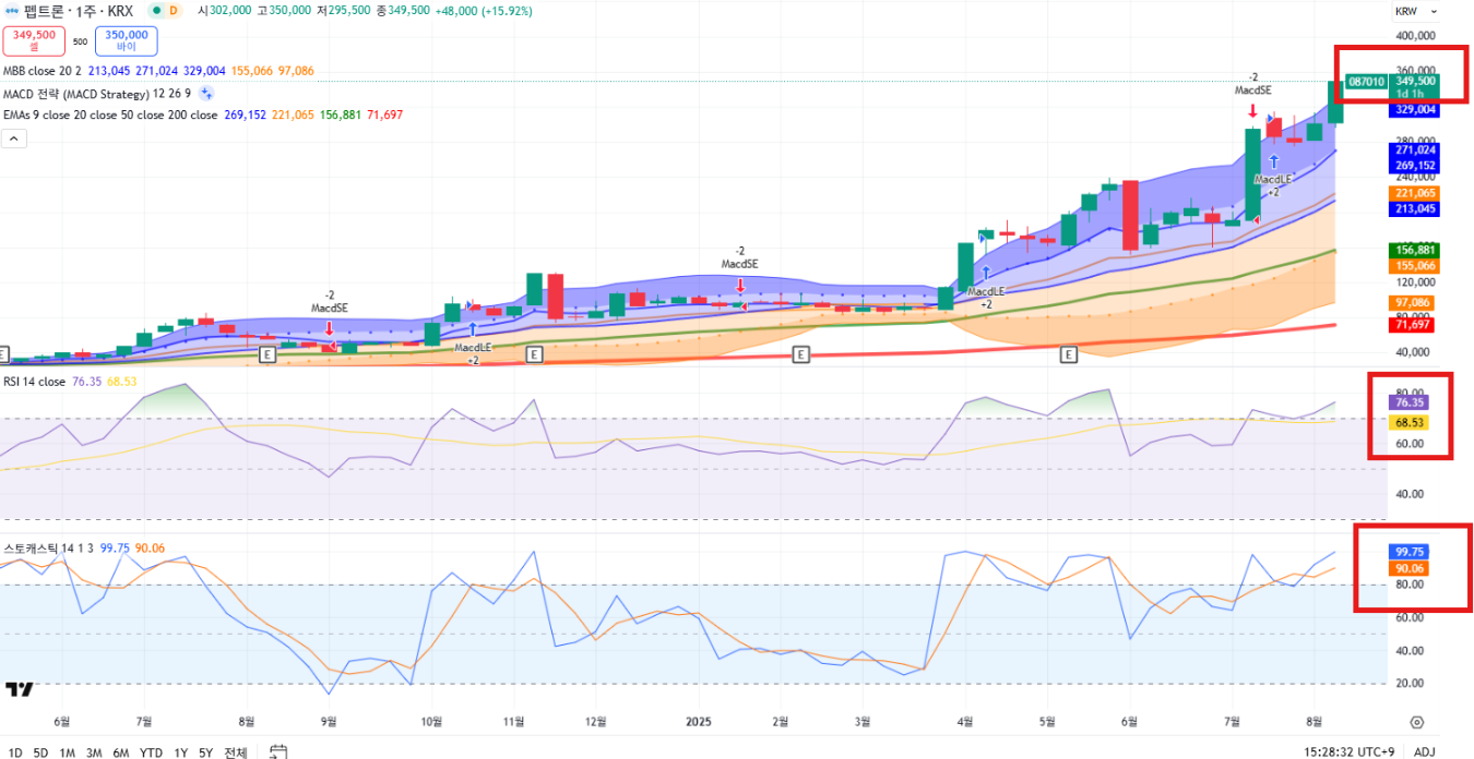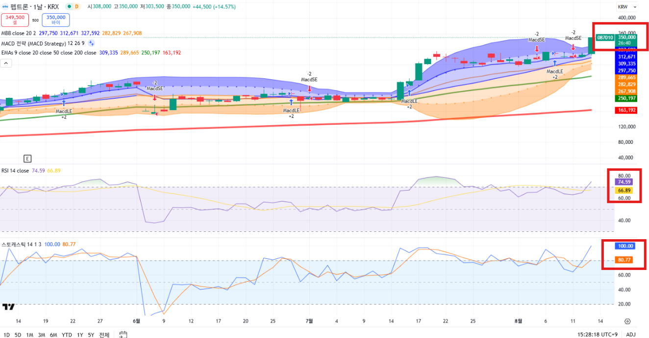 RSI,스토캐스틱 모두 과매수권이며, 최고가였던 360,000원을 테스트할 가능성이 높아 보여요. 360,000원을 저항 맞고 떨어지면 살짝 조정이 올 수도 있어 보입니다.