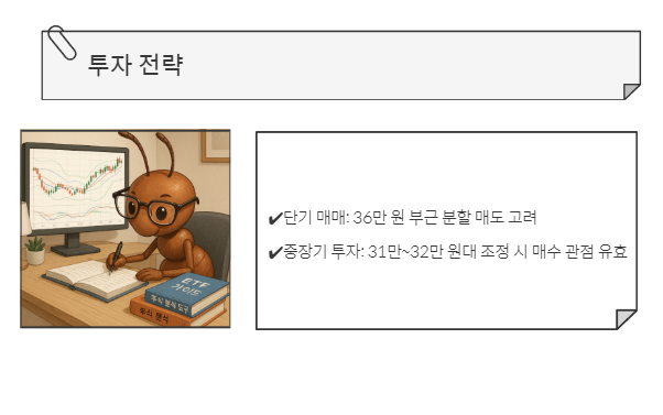- 단기 매매: 36만 원 부근 분할 매도 고려
