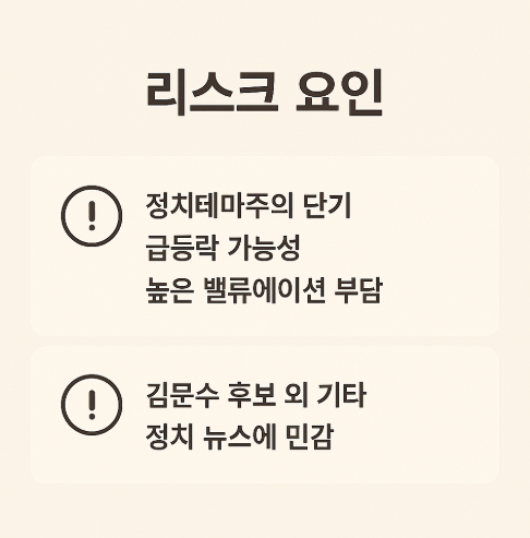 평화홀딩스는 현재 ‘정치테마주’로서 단기 수급이 몰리는 대표 종목입니다. 김문수 후보의 지지율 변화나 관련 뉴스에 민감하게 반응할 수 있으므로 짧은 호흡의 트레이딩 전략이 유리합니다. 중장기 투자 관점에서는 본질 가치 대비 과열된 부분이 존재하므로 분할 매수, 빠른 손절 기준 설정이 필요합니다.