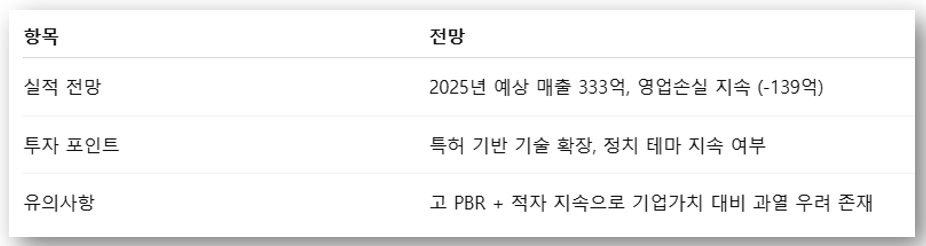 단기적으로는 기술적 반등 가능성, 정치 테마 지속 여부에 따라 변동성 클 수 있음. 그러나 실적 성장성 확보가 없다면 중장기 조정 위험도 존재합니다.