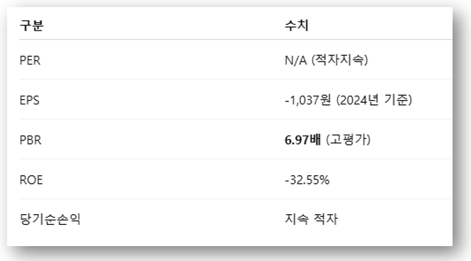 - PBR 6.97배: 코스닥 평균 대비 2배 이상 고평가