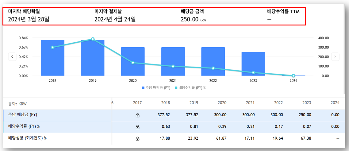 - 2024년 배당금: 250원 (전년 대비 축소)