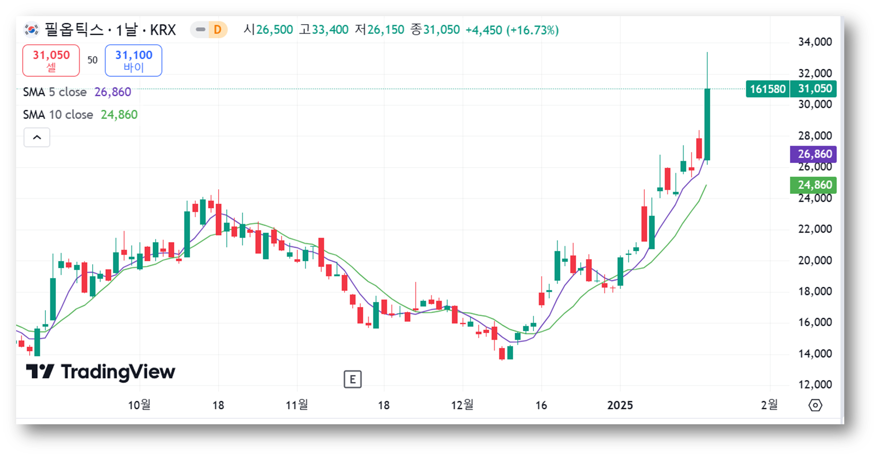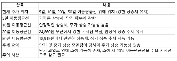 중기적으로는 20일 이동평균선(24,860원)이 강한 지지선 역할을 하고 있으며, 주가가 이 선 위에서 안정적으로 움직이고 있으며, 장기적인 관점에서도 50일 이동평균선(18,919원)이 완만하게 상승하고 있어 장기 상승 추세가 지속될 가능성을 나타냅니다.