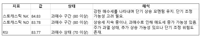 %K와 %D가 모두 80이상으로 과매수 구간에 있는데요, 이는 강한 매수세를 나타내며 단기 상승 모멘텀이 강하지만, 과매수로 인해 단기적인 조정 가능성도 고려해야 합니다.