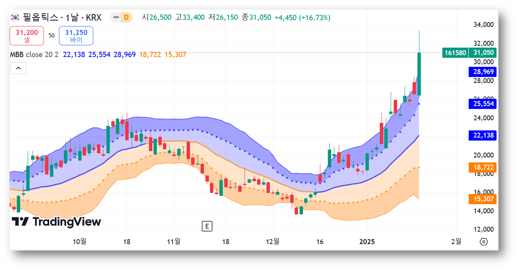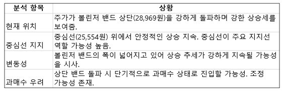 현재 주가는 볼린저 밴드 상단(28,969원)을 강하게 돌파하며 강한 상승세를 보여주고 있는데요, 이는 단기 매수세가 매우 강하다는 것을 보여줍니다.