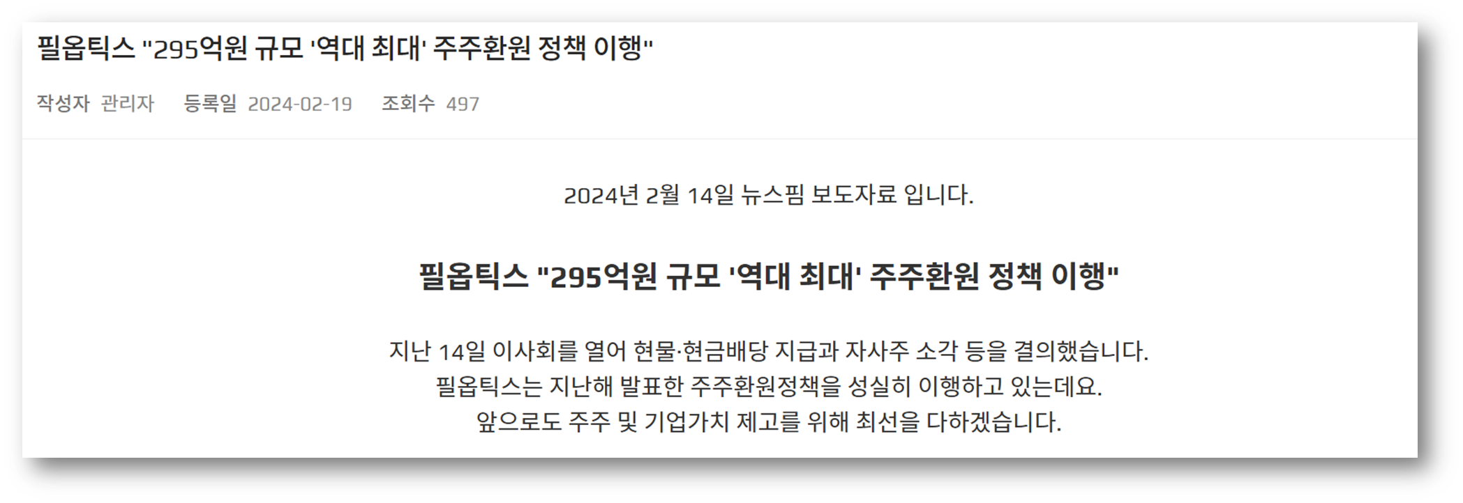 배당금 지급 정보를 알아보았는데, 2024년 4월 지급 이후, 아직 소식이 없는 것으로 알려져있습니다. 필옵틱스 회사 홈페이지에서도 지난 해 역대 최대 주주환원 정책을 이행했다는 보도자료를 언급하고 있는데요, 앞으로 주주 및 기업 가치 제고를 위해 최선의 노력을 다하겠다는 사측의 입장입니다. 추후 배당 소식이 알려지면 보도자료로 나올 것으로 예상됩니다.
