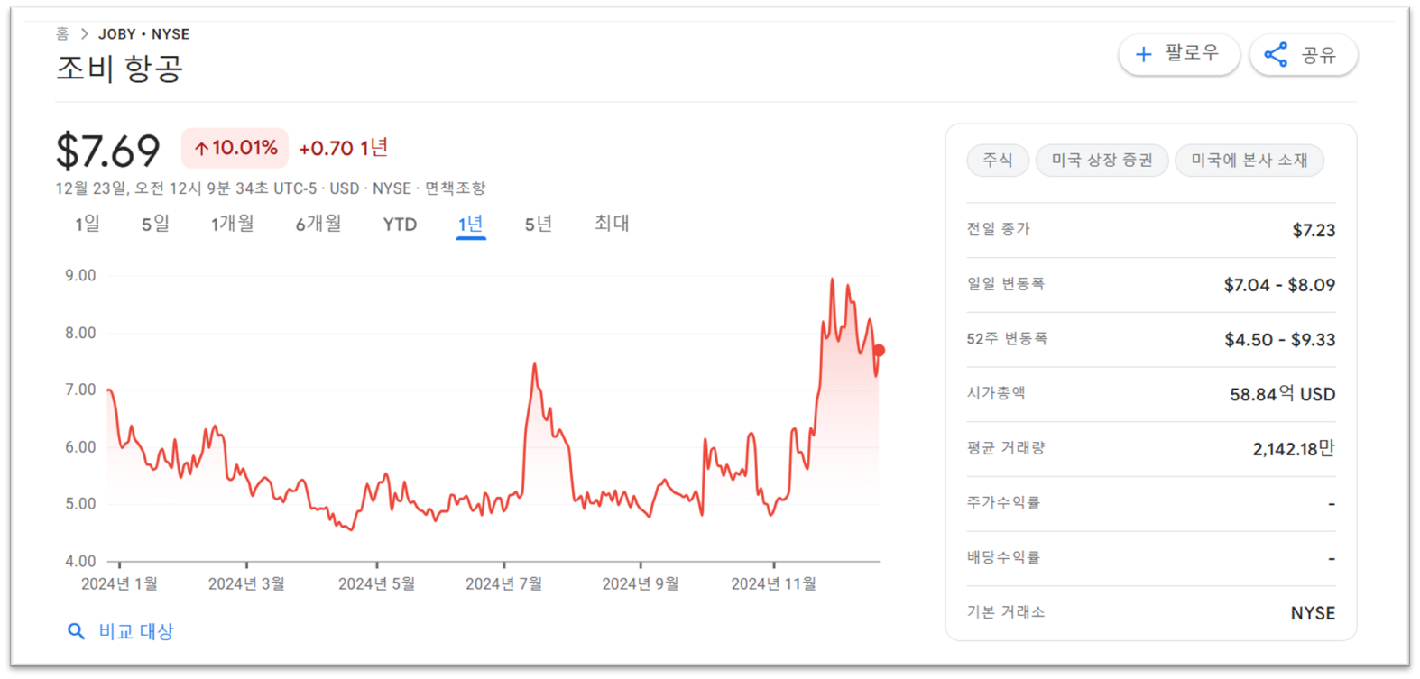 ⬆️구글 파이낸스에서 조비 시세 현황을 확인하세요⬆️