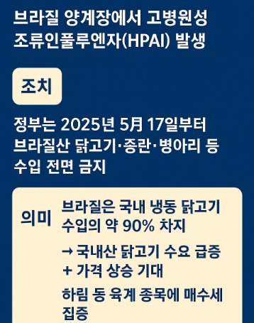 - 조치: 정부는 2025년 5월 17일부터 브라질산 닭고기·종란·병아리 등 수입 전면 금지
