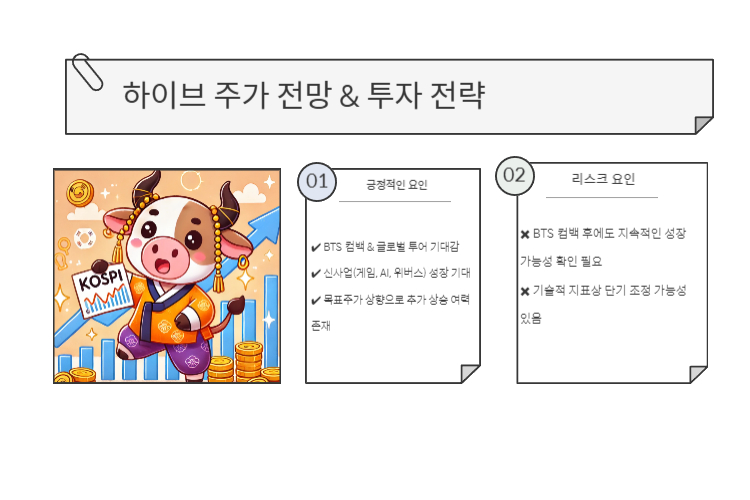 "BTS의 글로벌 투어 발표와 AI·게임 사업 확장으로 주가 상승 가능성 높다."